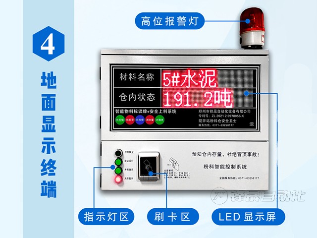 2.地面顯示終端通常安裝在粉料倉(cāng)附近的顯眼位置,方便操作人員隨時(shí)查看。它的FED屏上也會(huì)數(shù)字化顯示物料的信息。